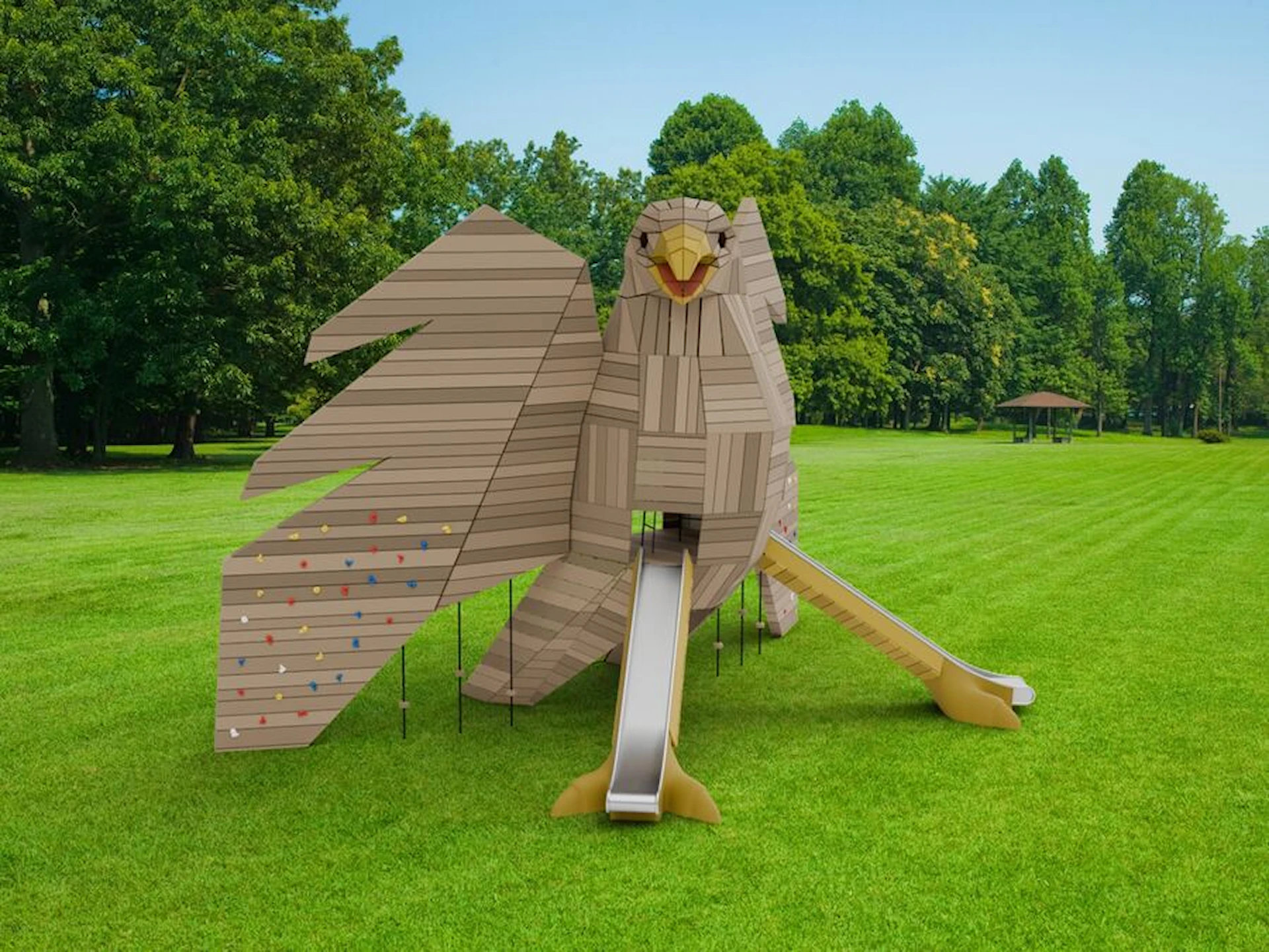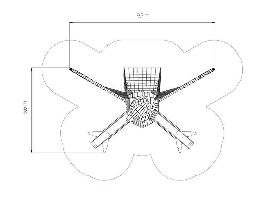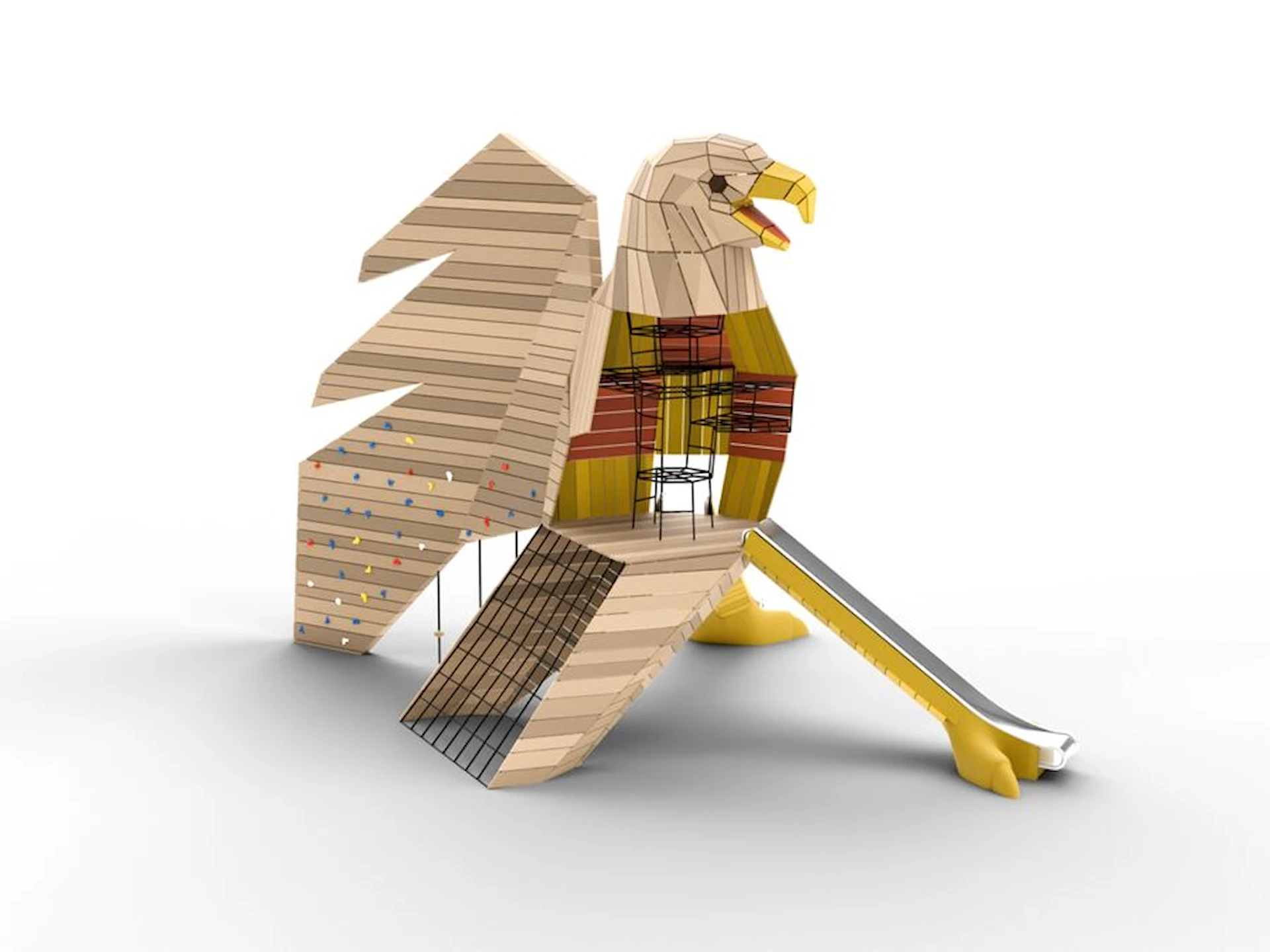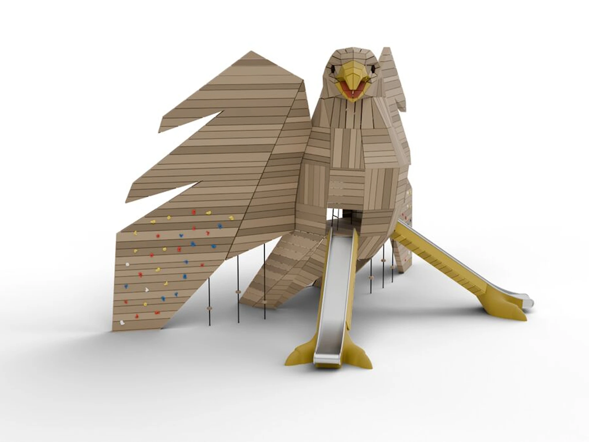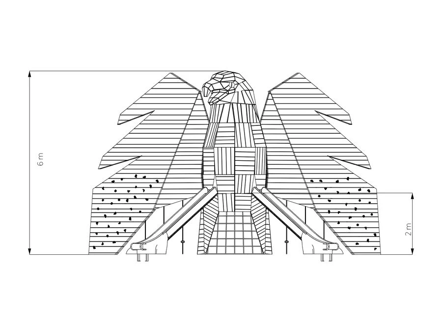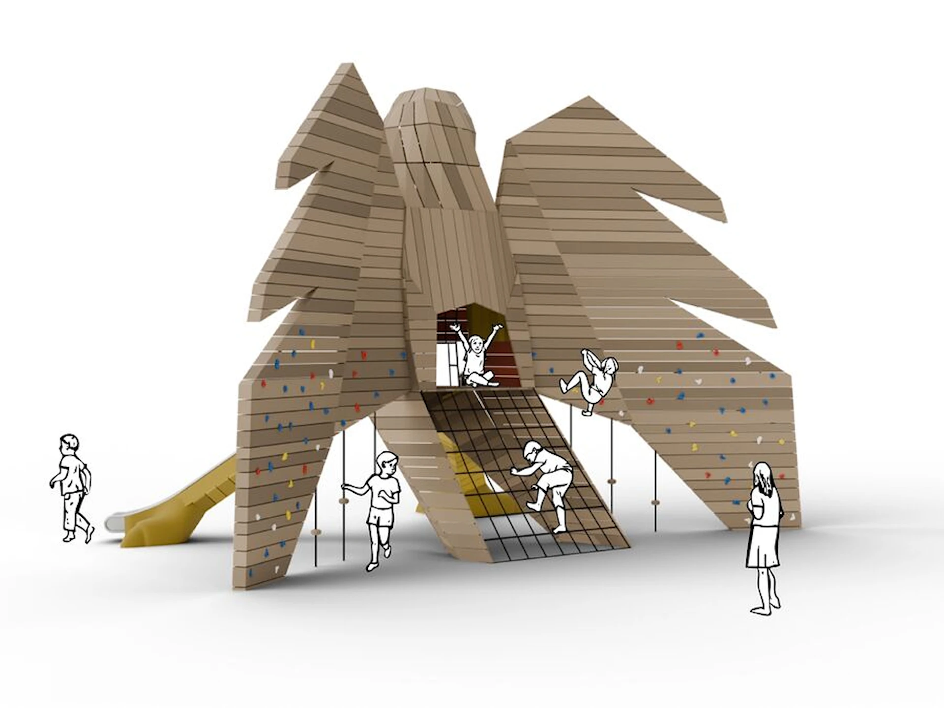 Vingene er utstyrt med klatregrep og inviterer til bevegelse og balanse. De to beina fungerer som rutsjebaner, og gir to tydelige og lekne veier tilbake til bakken. Bevegelsesmønsteret blir sirkulært og intuitivt – opp gjennom kroppen, ut via vingene eller ned gjennom beina.