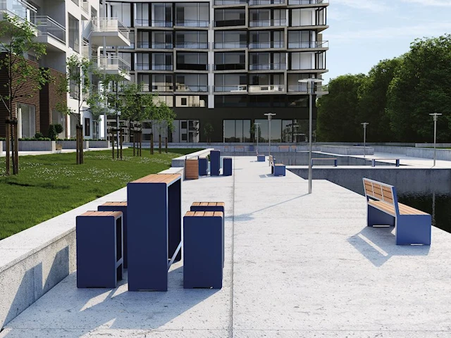 Ved å kombinere disse matchende parkmøblene kan man skape en gjennomtenkt helhet der funksjon, estetikk og materialvalg møtes. Plantekassene visker ut skillet mellom harde flater og grøntområder, mens sykkelstativ og barbord tilfører hverdagsfunksjoner som gjør stedet mer anvendelig.