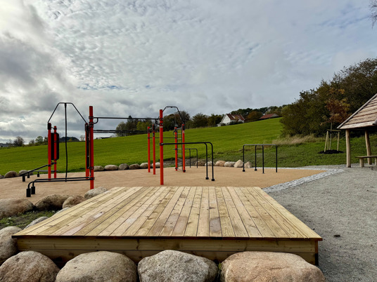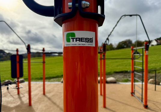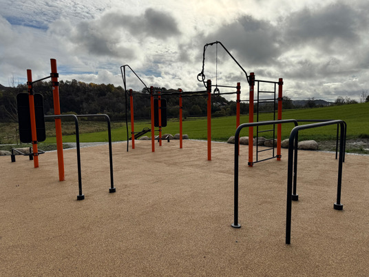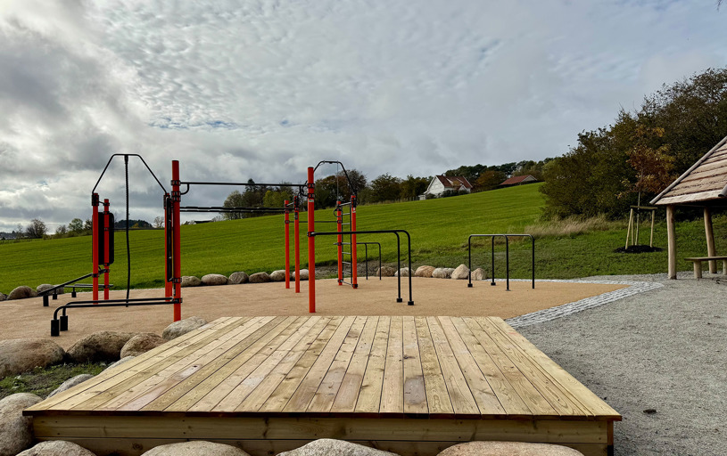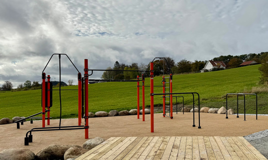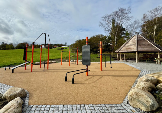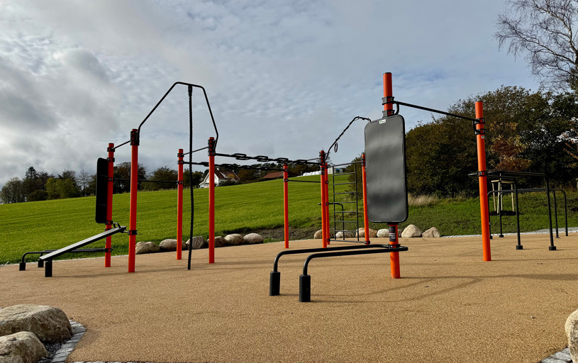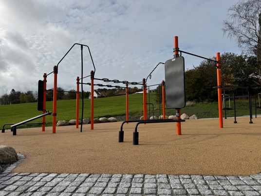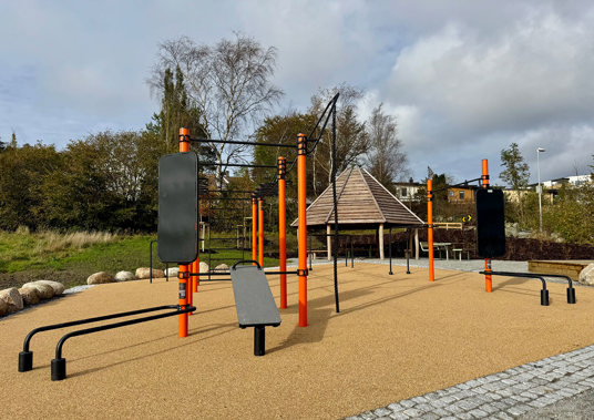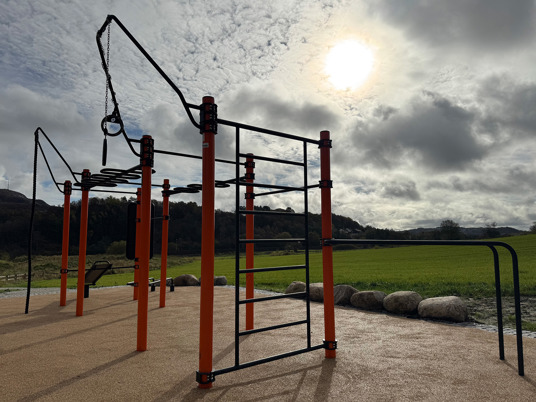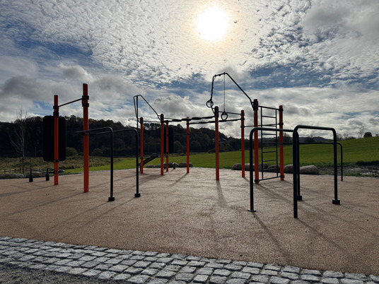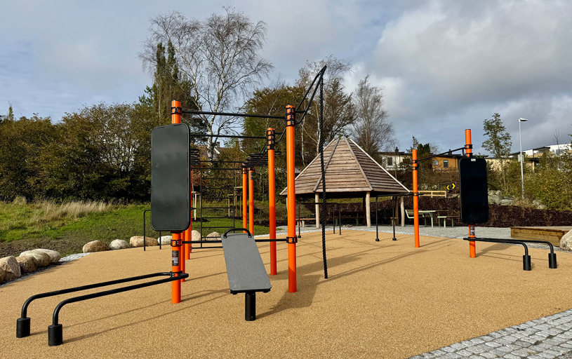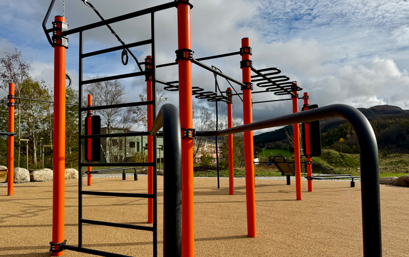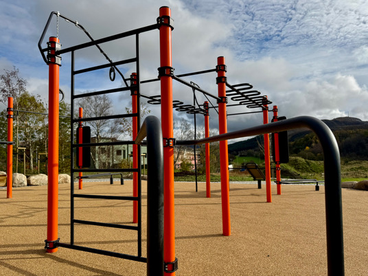 Rundt hovedstasjonen gir ElementFit Stronger og Ninja Over/Under-hinderet ekstra variasjon og muligheter for lekende aktivitet. Sammen skaper de et uteområde som føles åpent, vennlig og tilgjengelig for hele nabolaget. Treningsparken er levert i oransje RAL 2009 og gir parken et tydelig uttrykk som lyser opp området og inviterer til bruk.