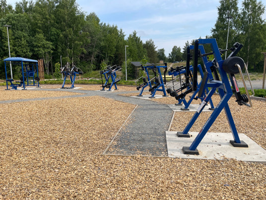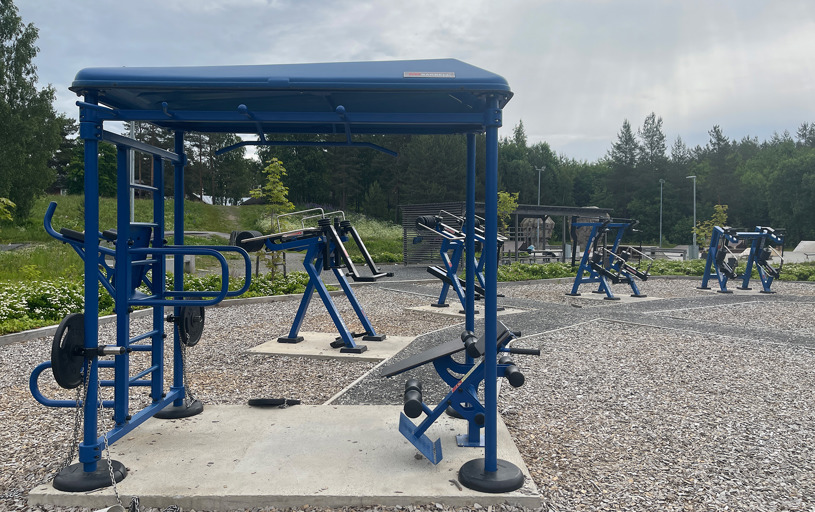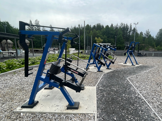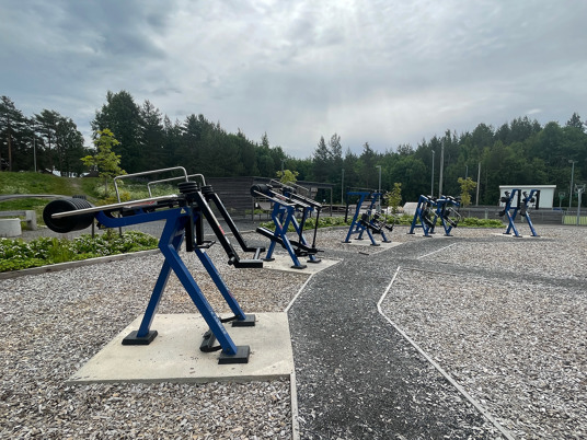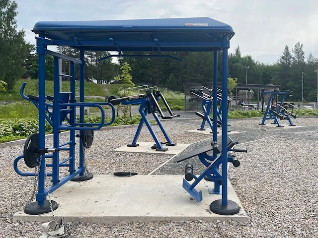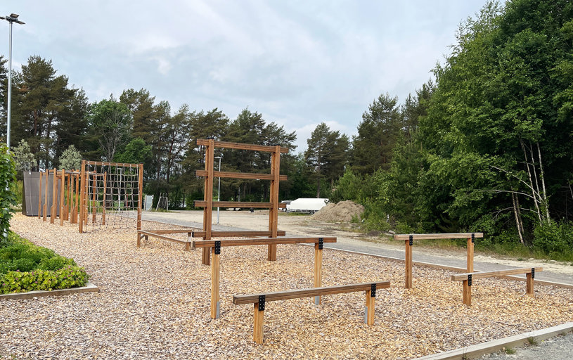 Et komplett utendørs treningsområde med seks justerbare treningsapparater som muliggjør styrketrening for hele kroppen. I tillegg finnes det et StreetWorkout-stativ og en treningsstasjon i tre. Utstyret er solid og værbestandig, designet for å passe både nybegynnere og erfarne treningsentusiaster.
