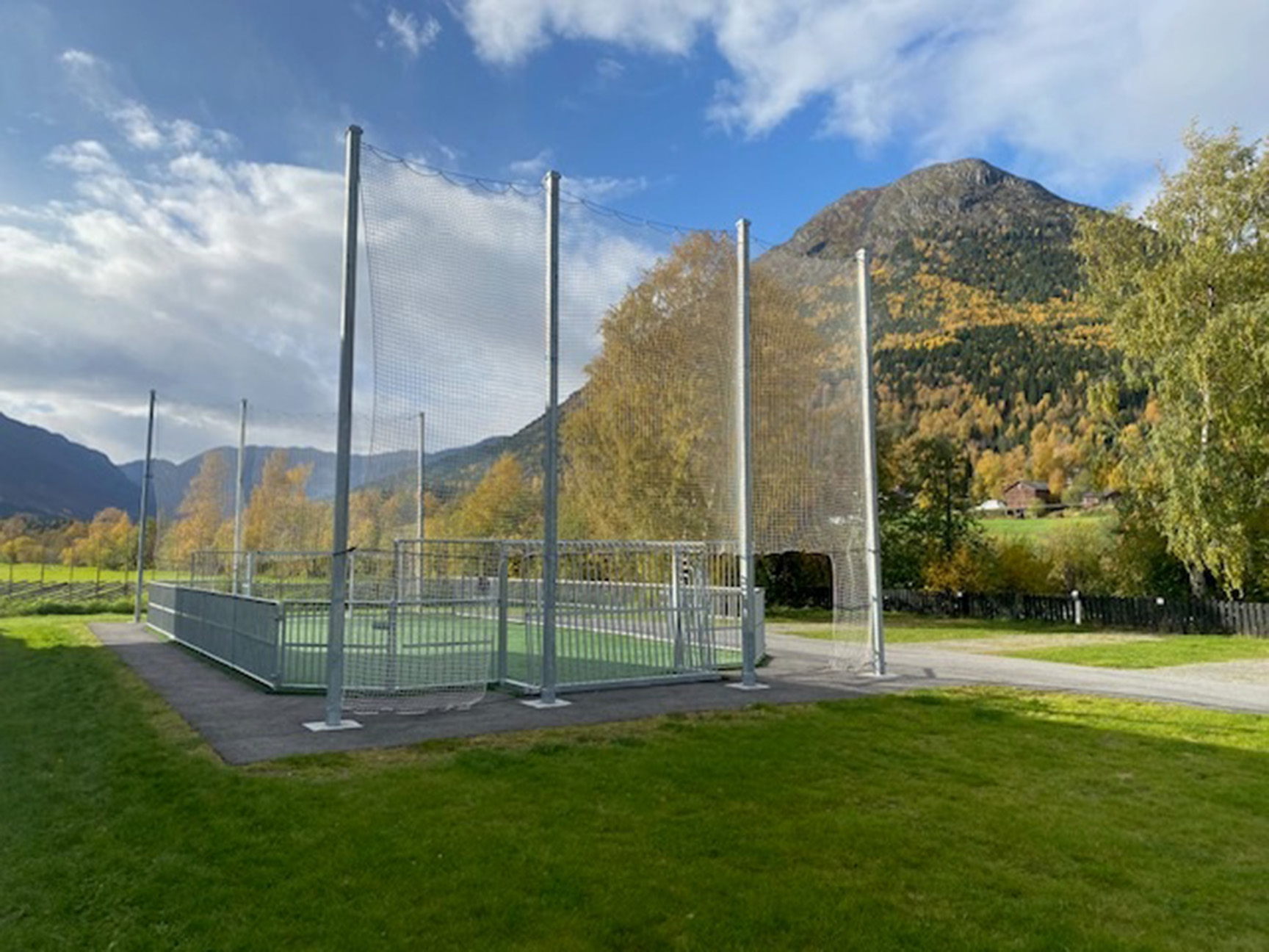 På Lom campingplass finner du en ballbinge i stål som byr på lek og spill for både store og små tilreisende. Her får man muligheten til å kombinere flere forskjellige aktiviteter som fotball, basketball, badminton eller annen egen spontanidrett. I Lom campingplass’ ballbinge har vi også levert et slitesterkt kunstress for å gi den beste spillopplevelsen. Sperrenettene i kortsidene sørger for at høye baller holdes innenfor banen. Ballbinge i stål er en slitesterk arena som bidrar til å fremme bevegelse blant barn og unge, og inviterer til samhold, samarbeid, aktivitet og moro!