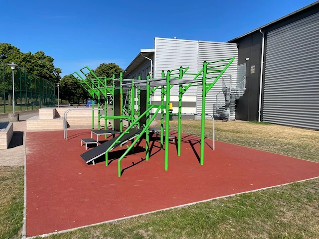 Lekeapparatet er tatt utgangspunkt i "Hedvig" apparatet vårt, som vi har tilpasset etter kundens behov og ønsker. Lekeapparatet kombinerer plattformlek med variert og utfordrende klatring. Barna kan klatre på vegger, balansere på taubroer, bruke taustiger og lianer, rutsje ned rutsjebanen eller trene styrke og koordinasjon i armgangen. Med flere utkikksposter og plattformer er det nok av plass for lek og utforskning på ulike nivåer.
