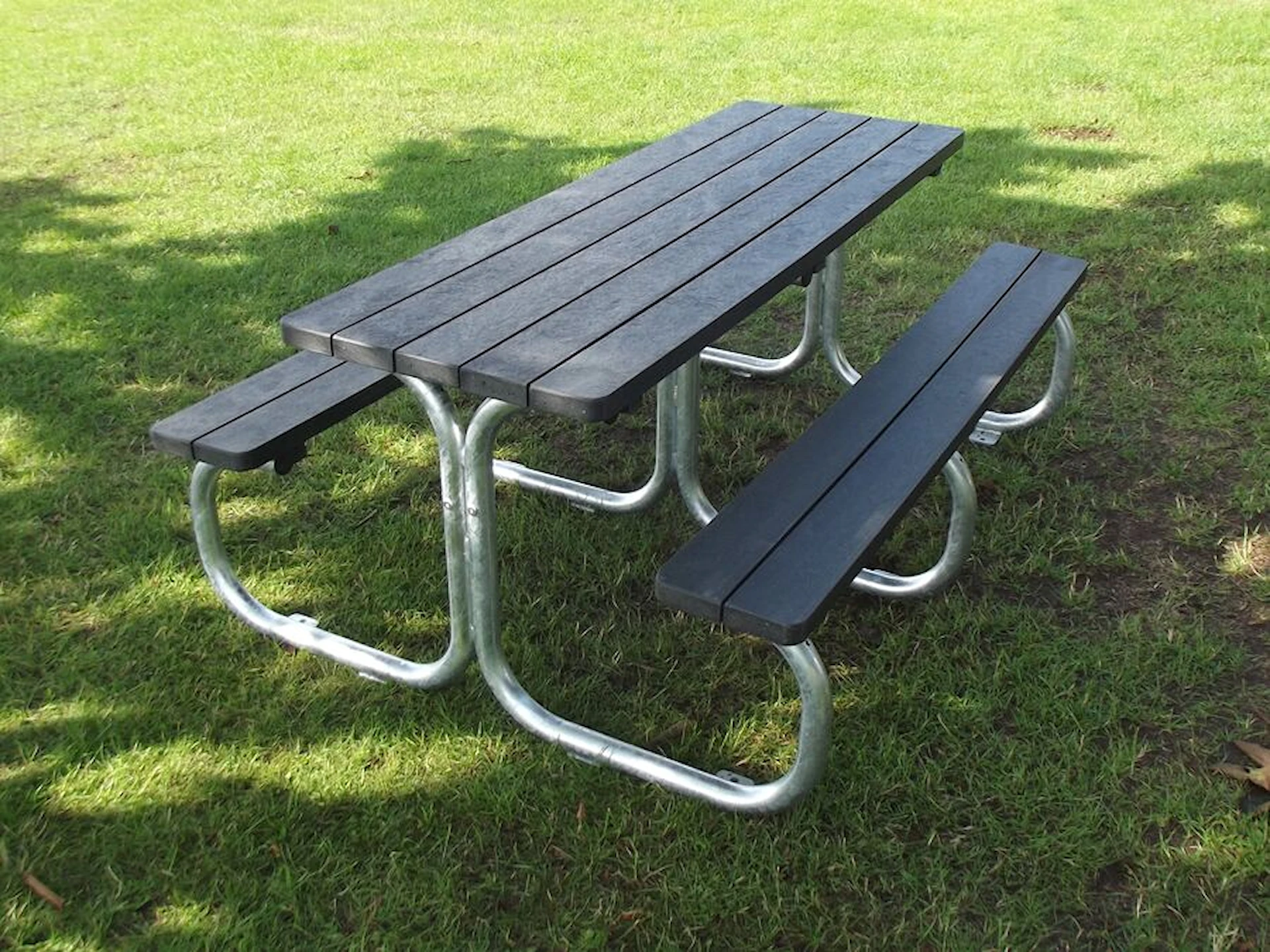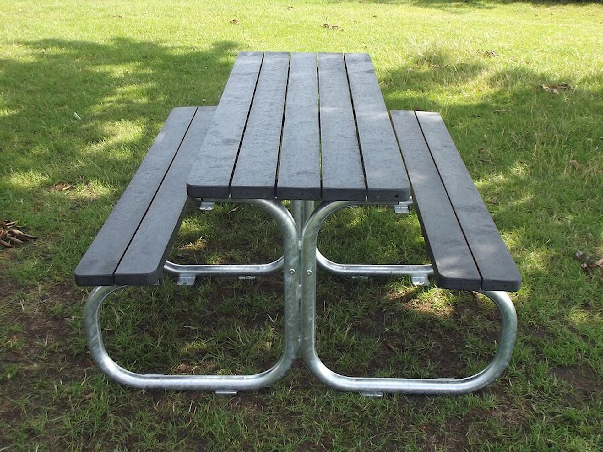 Benkebordet leveres som standard med grå planker av resirkulert plast, men kan også bestilles i svart eller brun. Produsert i Danmark – kvalitetsmøbler til utemiljø.