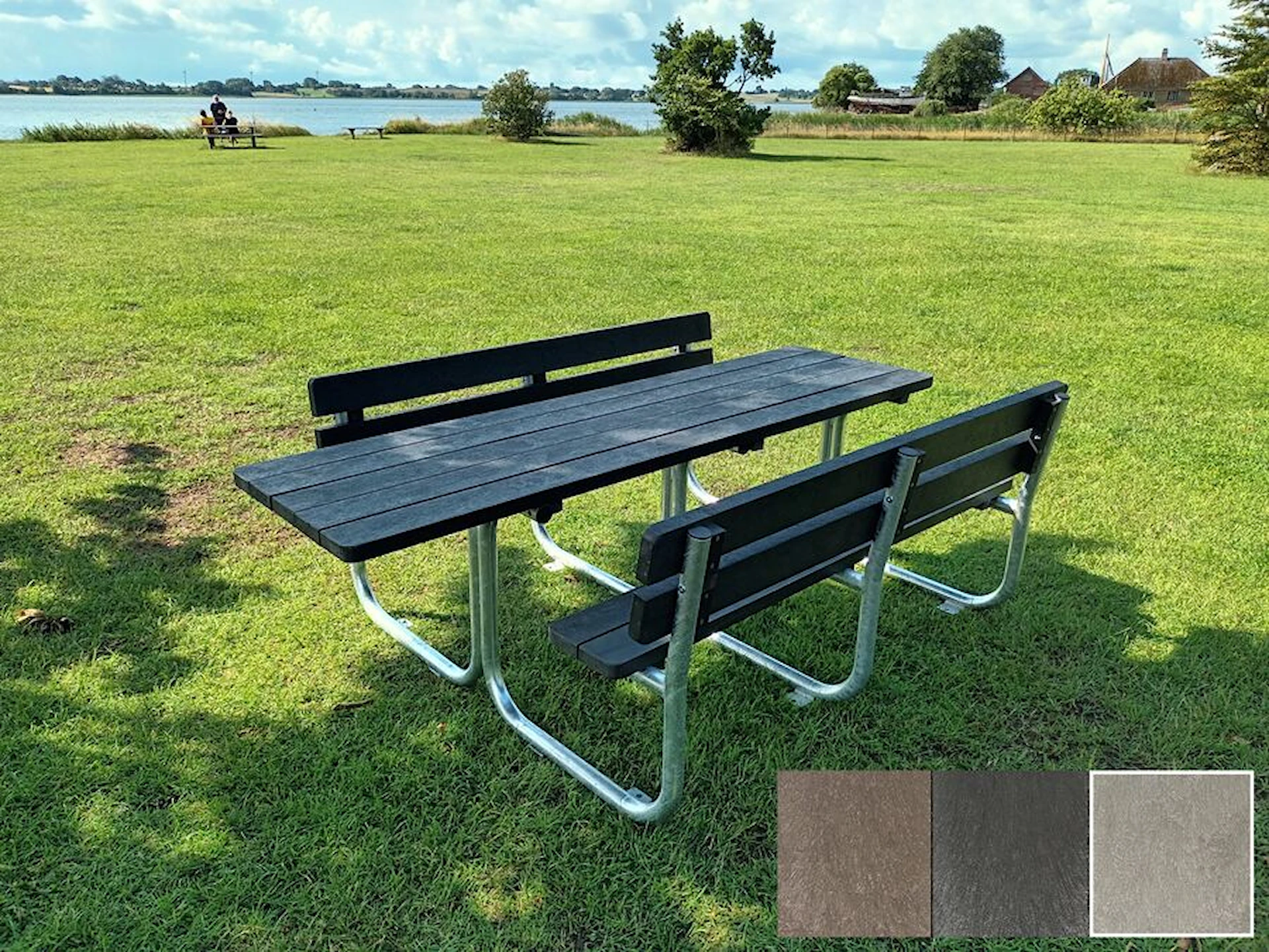 Dette benkbordet leveres som standard med grå planker av resirkulert plast, men kan også leveres i svart og brun farge. Danskproduserte kvalitetsmøbler til utemiljøet.